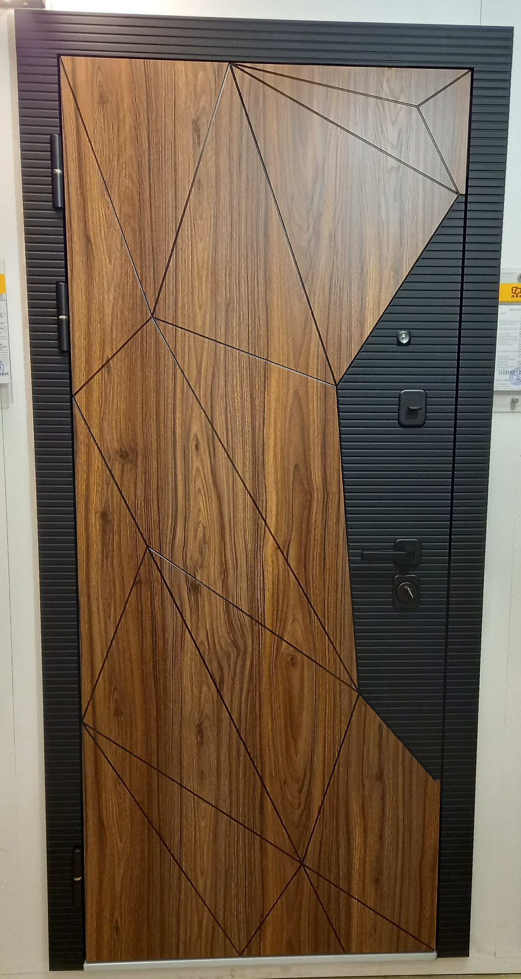 МДФ щит 10 мм с филенчатым рисунком. МДФ наличники. № 277 Цвет: Софт черный + Орех каньон коньяк. Трехслойное полимерное покрытие. Цвет: МУАР ЧЕРНЫЙ.