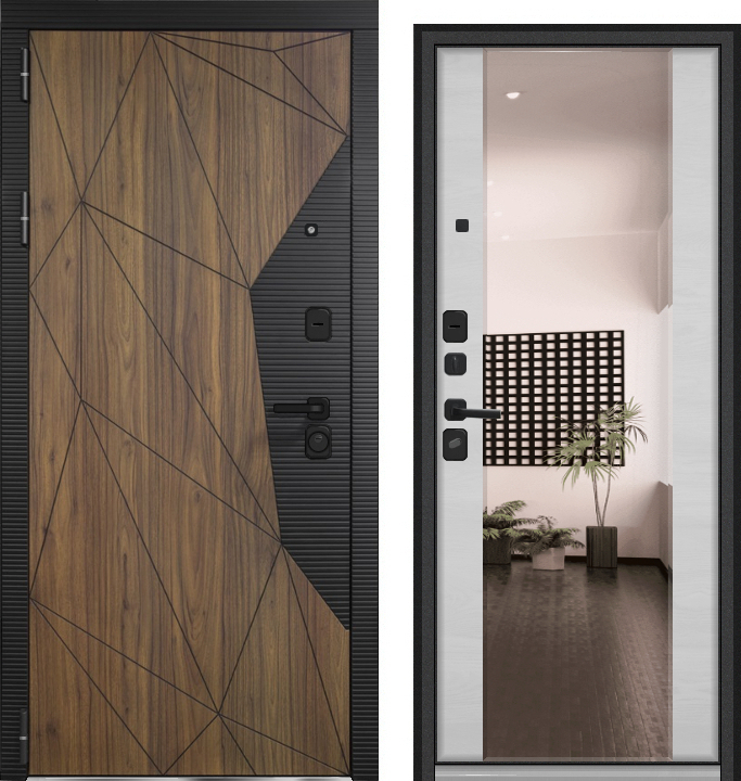 Дверь мет. БЕРИЛЛ КВАДРО-3 (Софт черный+Орех каньон коньяк, Дуб кантри горизонт) (2050*960, левая, Зеркало без гравировки , фацет по периметру , черный муар, черн.фурн)