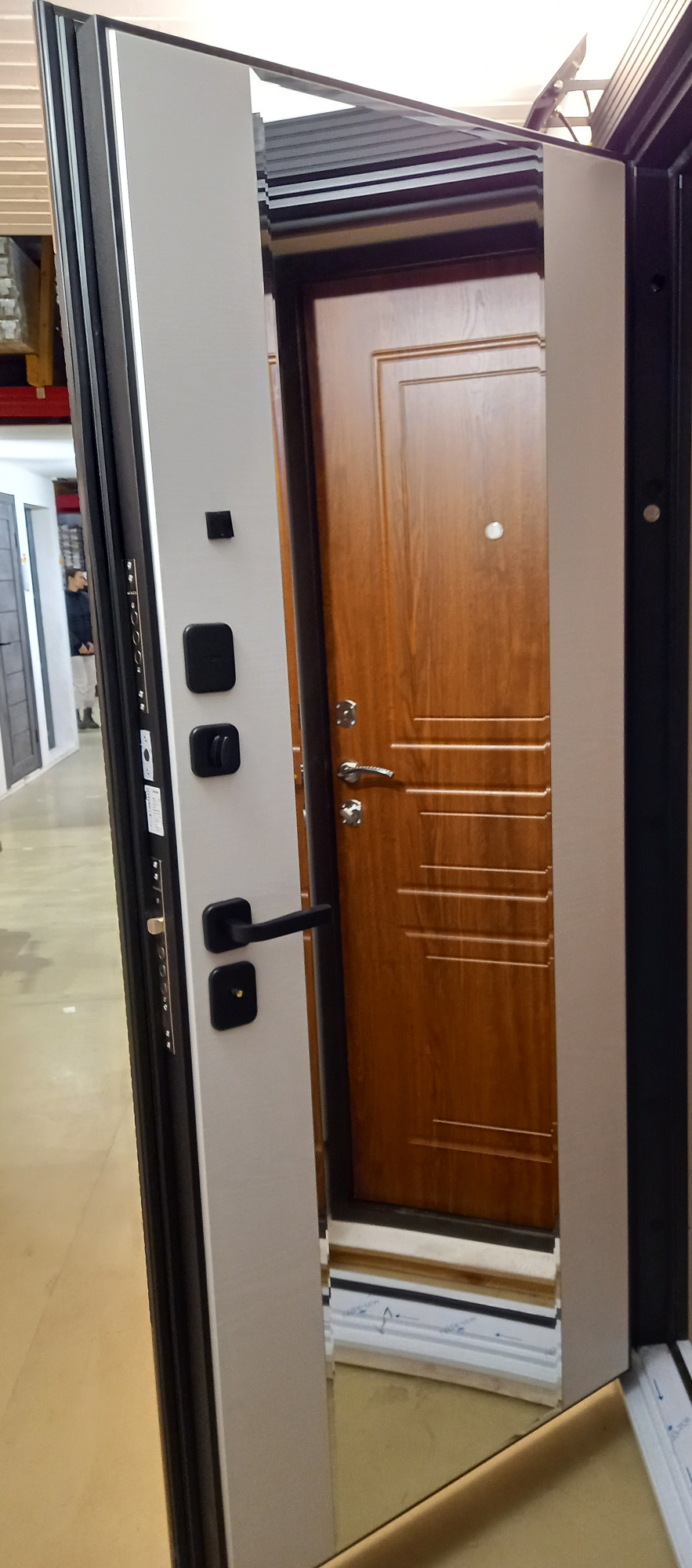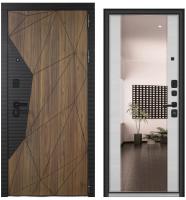 Дверь мет. БЕРИЛЛ КВАДРО-3 (Софт черный+Орех каньон коньяк, Дуб кантри горизонт) (2050*880, левая, Зеркало без гравировки , фацет по периметру , черный муар, черн.фурн)