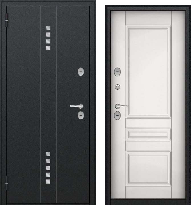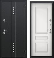 Тульские двери Б45 Термо АРКТИКА (2050*860, левая, черн. букле,нерж декор, МДФ12мм фреза Б-122,ПВХ белая гладк.фурн хром)