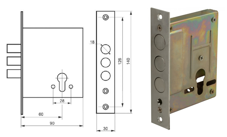 Описание: Замок врезной цилиндровый, без цилиндра, рекомендован для установки в металлическую дверь с толщиной профиля не менее 60 мм.